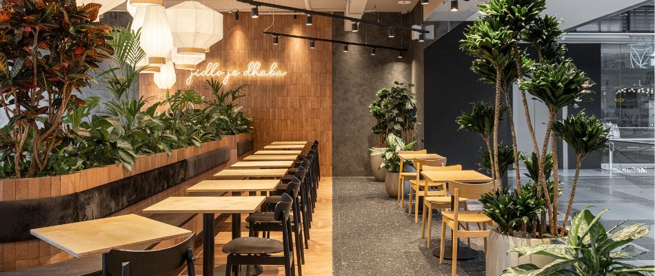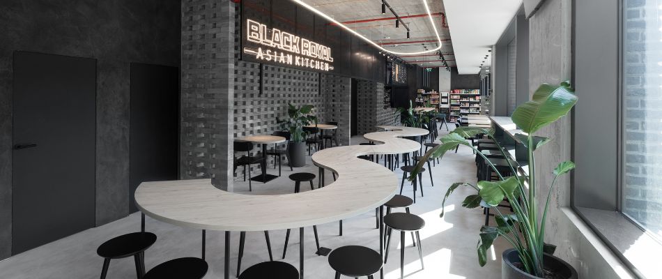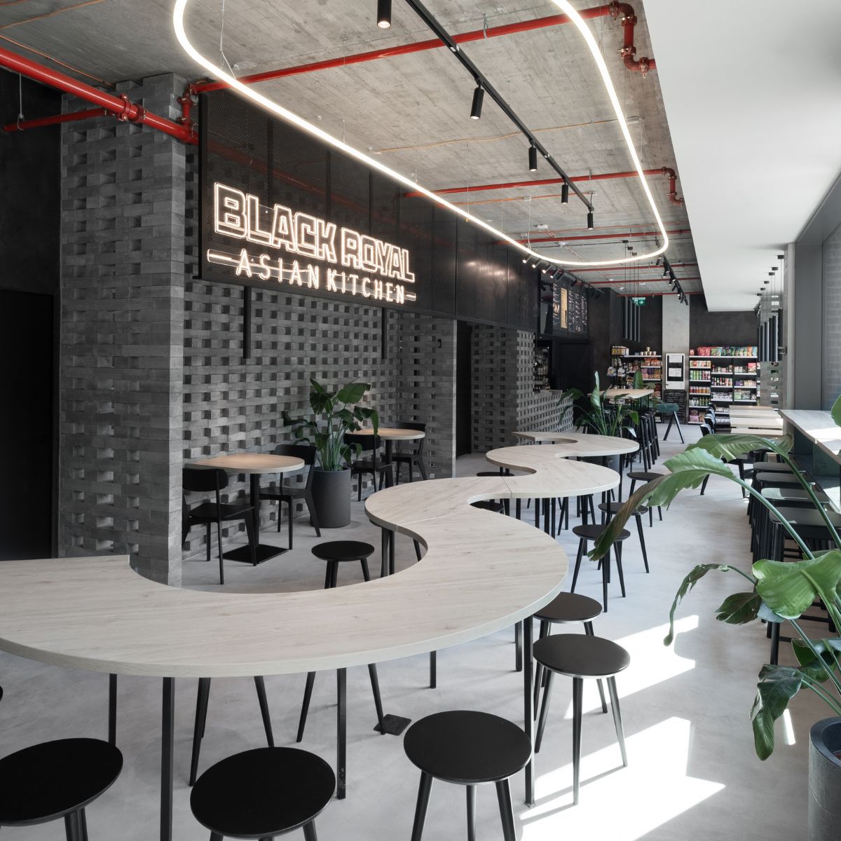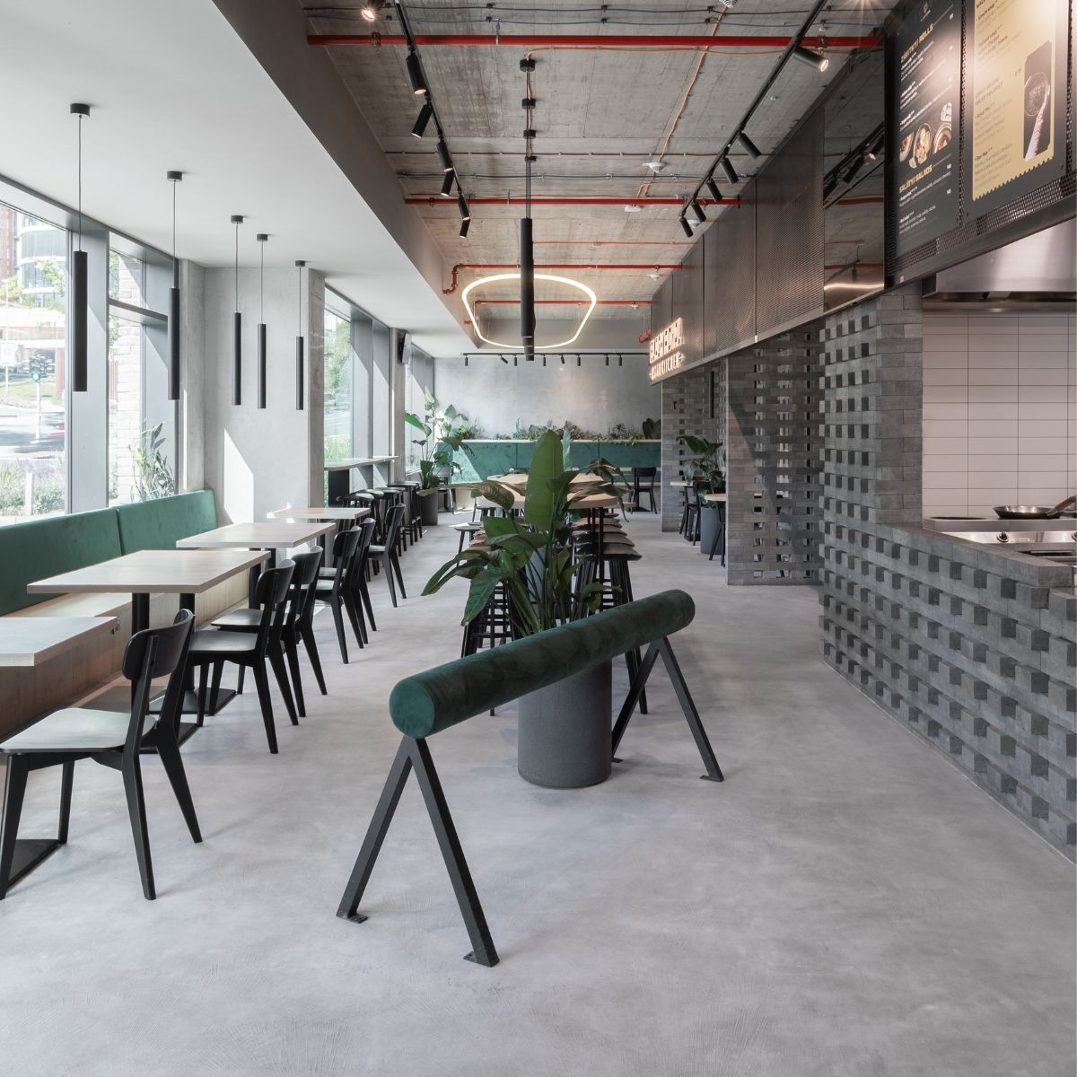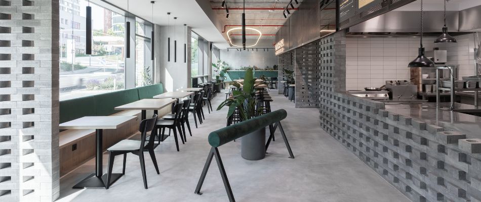 Pracuje s příjemným zónováním, dřevem a jemnými barvami, které dají vyniknout jejich barevným pokrmům. Prostor působí útulně, ale zároveň podporuje rychlý pohyb hostů a jasnou navigaci při samoobslužném servisu.